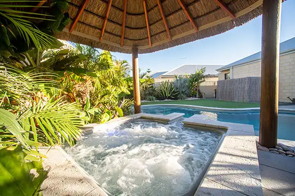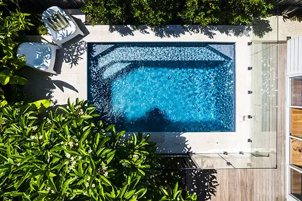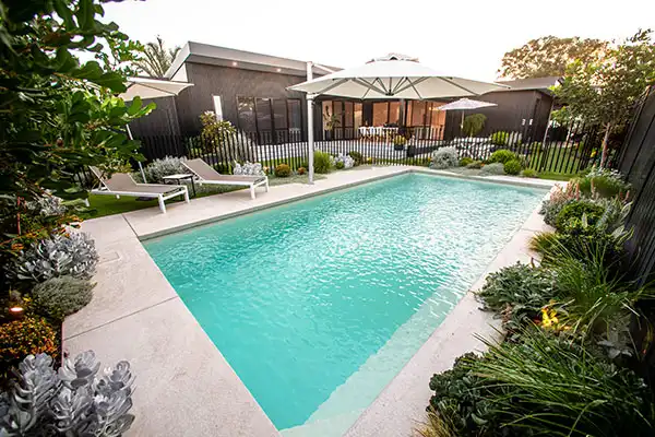 The owners selected this pool design as it included a large bench to one side, which they thought would be good for young kids and all ages to utilise. Their children have used it a lot and find it provides a level of comfort in the water as an area of reprieve while swimming. The light pool colour was chosen to reflect a traditional white beach sand base and provide a clearer water finish. The owners are very happy with the outcome.