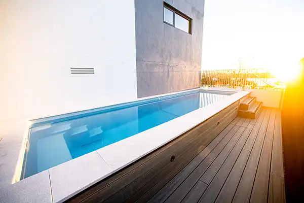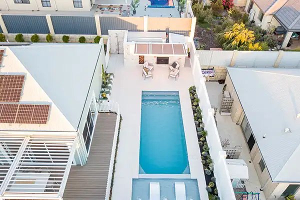 The 5m x 2.5m Allure and Apollo Spillway Spa are finished in Crystite® Classic Silver Mist. Low maintenance Trex Decking finishes off the pool area creating an example of a stylish small backyard. This pool and spa combination is perfect for both swimming and relaxing.