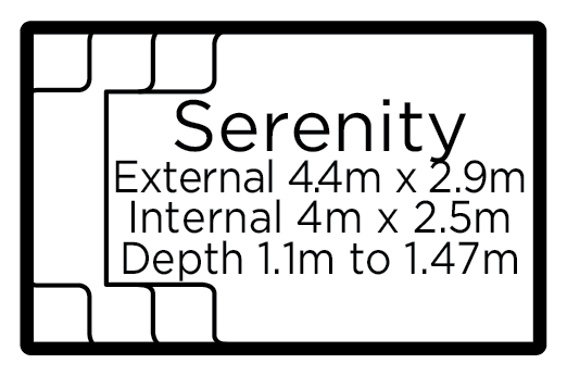 Unobtrusive, twin side entry steps and generous depths allow for maximum swimming area while an extended entry step in the shallow end creates the perfect relaxation zone.The Serenity has been designed with small outdoor spaces in mind. Narrow in design and compact in length, the Serenity is perfect for a small backyard.