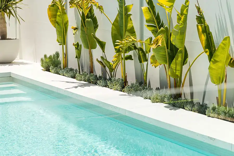 Surrounding your pool with palm trees, banana plants, and bird-of-paradise instantly gives it a resort-like atmosphere. Tropical plants thrive in warm, humid climates and provide shade while enhancing privacy. Mix tall palms with lower ferns and groundcovers for layered depth and place them in curved beds around the pool for a natural, flowing look.