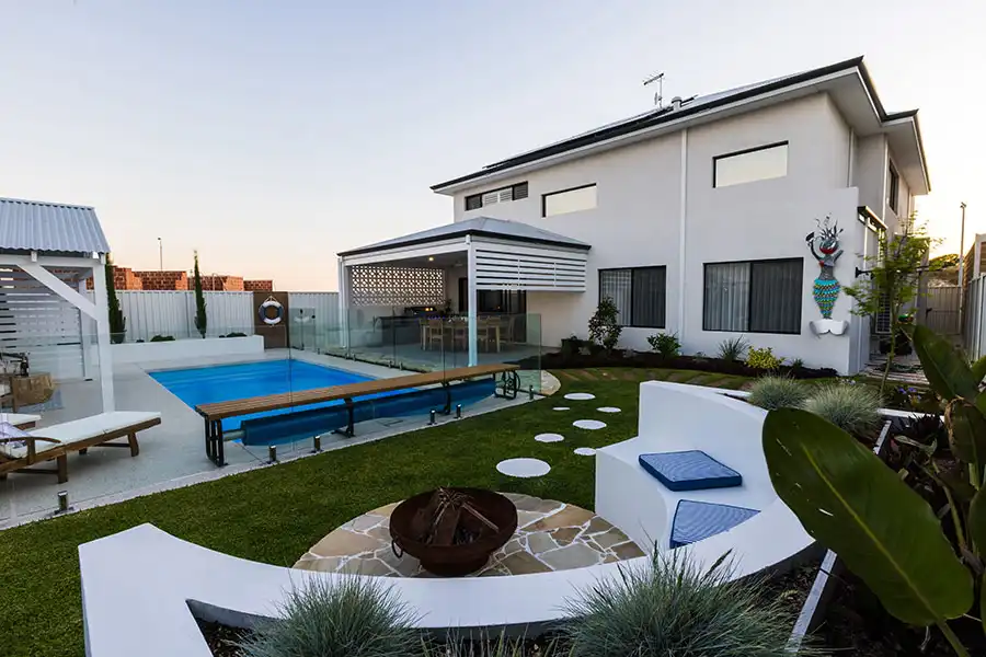 Landscaping isn’t only about plants, it’s about creating experiences. Place outdoor furniture in shaded alcoves surrounded by greenery or carve out a fire pit area with stone seating near the pool. These cozy nooks make your pool area a year-round gathering place for both relaxation and entertainment.