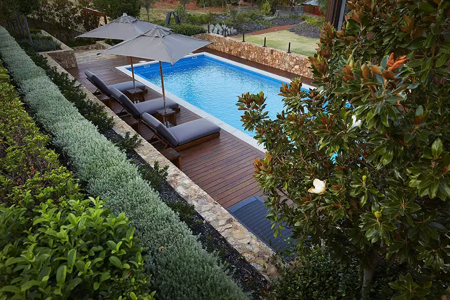 Bright blooms around your pool add vibrancy and seasonal variety. Choose low-maintenance, heat-tolerant flowers like lantana, hibiscus, or marigolds. Group flowers in clusters for maximum impact and arrange them near seating areas to add bursts of colour. Just be sure to avoid plants that drop a lot of debris, which could end up in your pool.